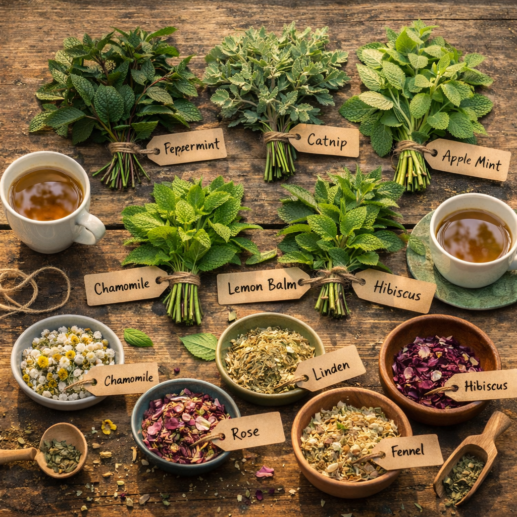 Mints are among the most versatile herbs for tea blending. Their aromatic leaves can stand alone or support other herbs by adding freshness, brightness, or gentle lift. This chart offers traditional, flavor-forward pairings rather than prescriptive formulas, inviting experimentation based on taste, mood, and season.